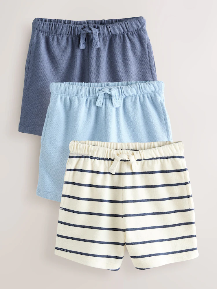 These practical Blue And Striped Textured Shorts 3 Pack are a comfortable option for warm weather. This 3 pack includes shorts in solid blue and light blue, and one pair of striped shorts, all made from a textured fabric. They feature an elasticated waistband with a drawcord.