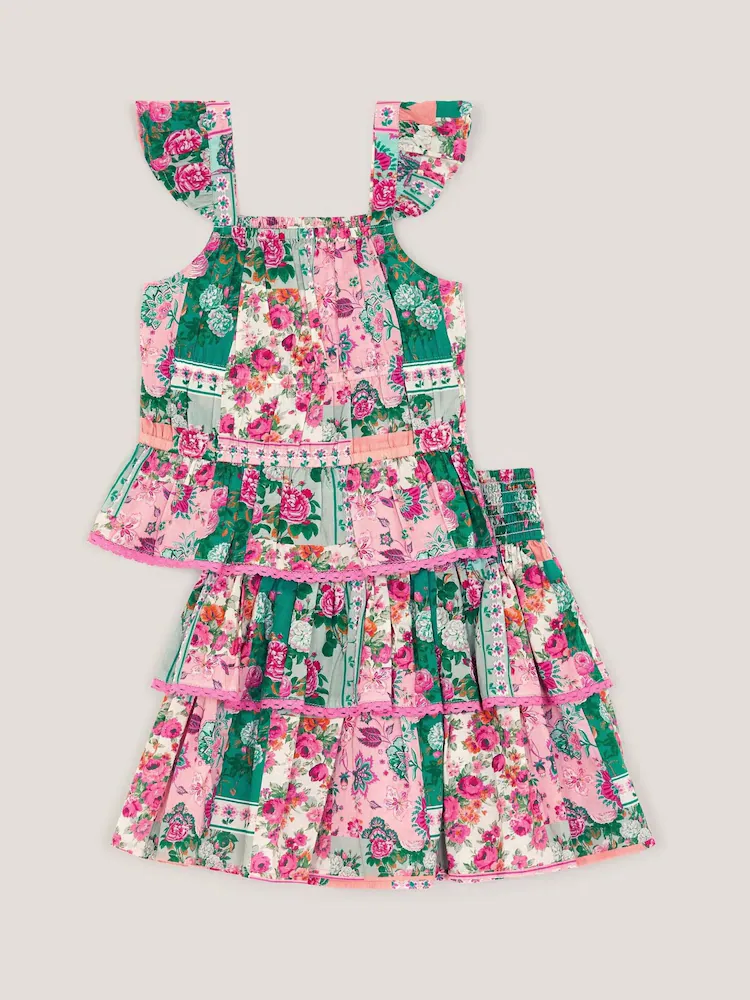 Mini bohemian. Showcasing a patchwork of vintage florals in blush and sage tones, this co-ord outfit is inspired by the past and made for the new generation of fashionistas. The set includes a frilly-strap top and tutu skirt with a comfy elastic waistband.
