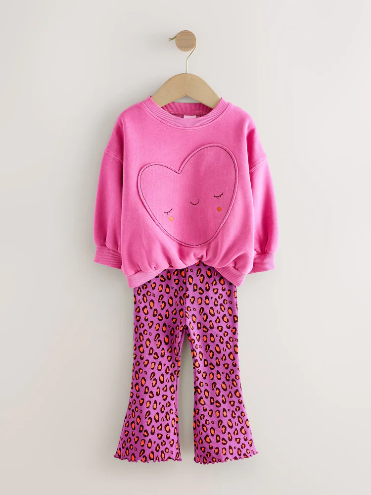 Get ready to spread some love and unleash a little wild fun with our adorable pink heart sweatshirt and flared leggings set. This charming two-piece outfit is designed for both magical adventures and cosy moments. Designed with sweet heart face to sweater and matching ribbed leggings.